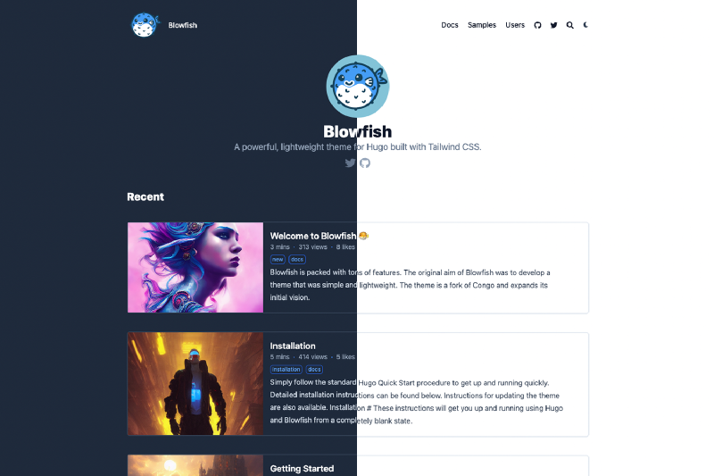 Blowfish was built so it would be easy to add visual support to your articles. If your familiar with Hugo article structure, you just need to place an image file (almost all formats are supported bue we recommend .png or .jpg) that starts with feature* inside your article folder. And that’s it, Blowfish will then able to both use the image as a thumbnail within your website as well as for oEmbed cards across social platforms.